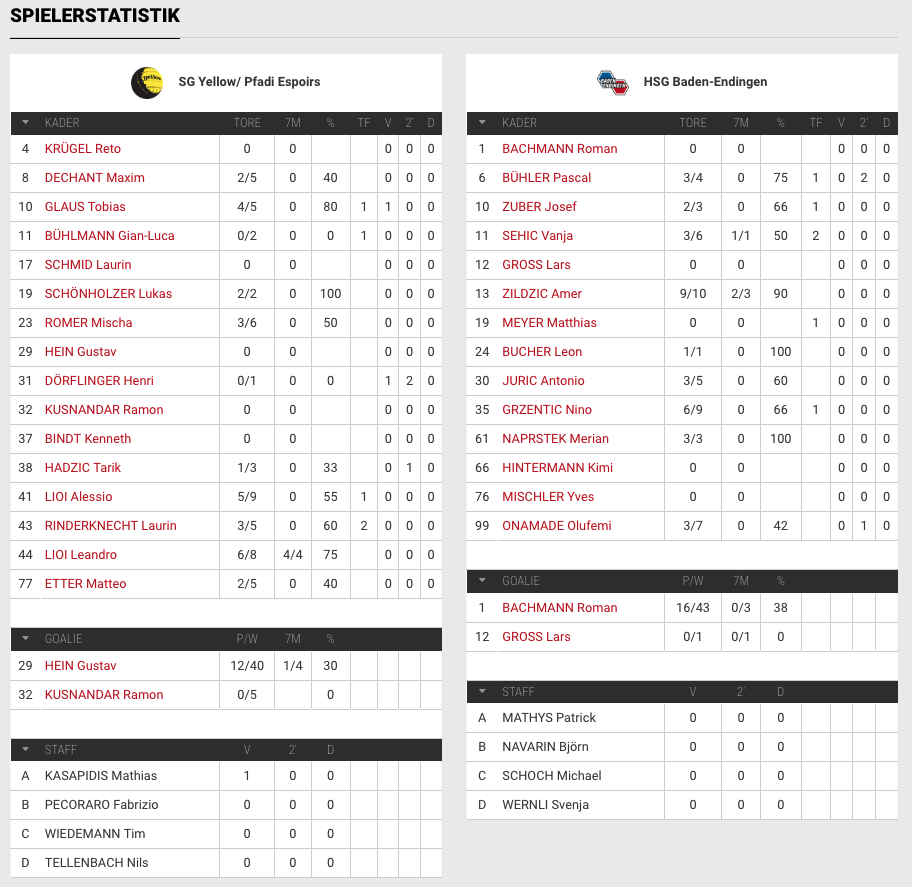 Die Breite des Kaders wird dabei immer mehr zu einem Faktor für das Team der HSG Baden-Endingen. Im Aargauer Derby gegen den TV Möhlin gelang Vanja Sehic eine herausragende Leistung. Heute überzeugte Amer Zildzic als Vollstrecker mit 9 Toren aus 10 Versuchen. Aber nicht nur ihm gelang ein gutes Spiel, auch Torhüter Bachmann (38%), Flügelspieler Naprstek (3), Rückraumschütze Grzentic (6) und viele mehr zeigten heute, dass auf sie Verlass ist. Nino Grzentic, der vor einer Woche Vater von zwei Töchtern wurde und das Spiel gegen den TV Möhlin am Ticker aus dem Spital verfolgen musste, hat heute mit einer guten Leistung überzeugt und mitgeholfen, die zwei wichtigen Punkte in den Aargau zu bringen.