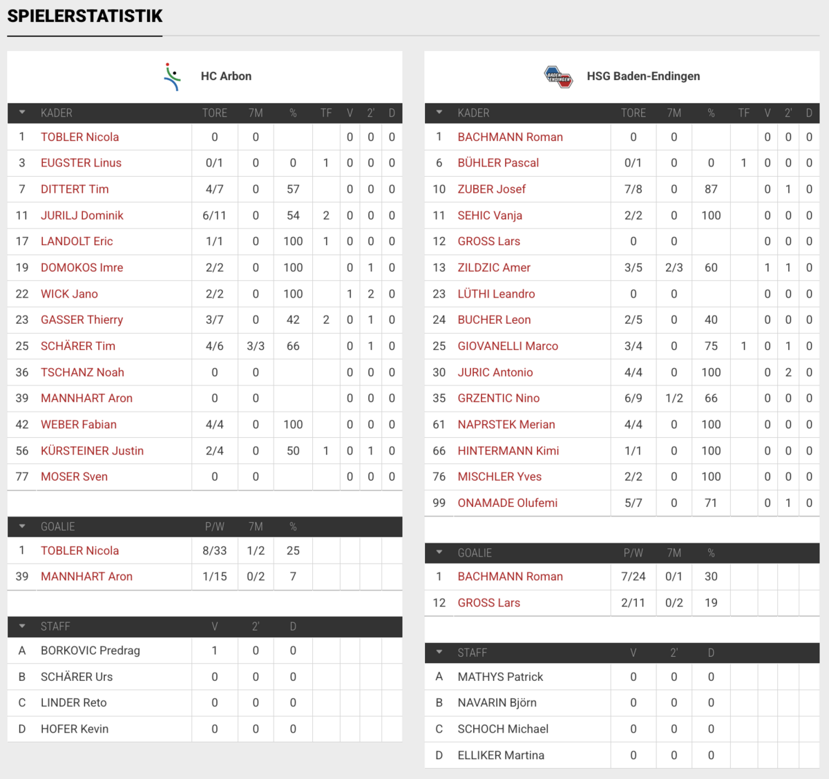Bereits in den Anfangsminuten setzten die Gäste ein klares Zeichen. Mit einem konzentrierten Start legte Baden-Endingen einen 3:0-Lauf hin, während Arbon Schwierigkeiten hatte, in die Partie zu finden. Nach 17 Minuten stand es bereits 12:6 für die Aargauer, die sich in der Folge nicht mehr aufhalten liessen. Besonders die schnellen Flügelspieler Zuber, Naprstek und Onamade sorgten für Tempo und Tore, während Kreisläufer Juric mit eiskalter Effizienz seine Chancen verwertete. Zudem zeigte Torhüter Bachmann mit sieben Paraden (42% Abwehrquote) eine starke Leistung und trug zur deutlichen 20:11-Pausenführung bei.