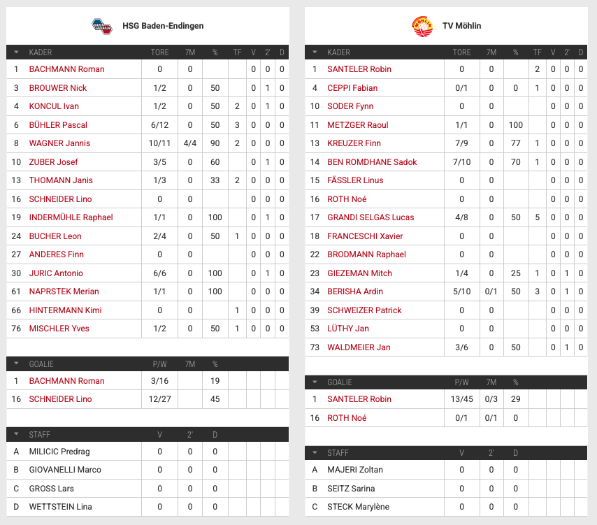 Die Partie begann kampfbetont und ausgeglichen. Nach neun Minuten stand es 6:6, ehe Baden-Endingen in doppelte Unterzahl geriet: Zuber musste nach einem harmlosen Foul auf die Bank, kurz darauf folgte wegen eines Wechselfehlers eine weitere Zeitstrafe. Möhlin nutzte diese Phase konsequent und erzielte drei Treffer in Folge.